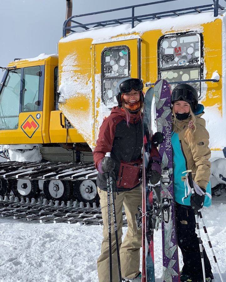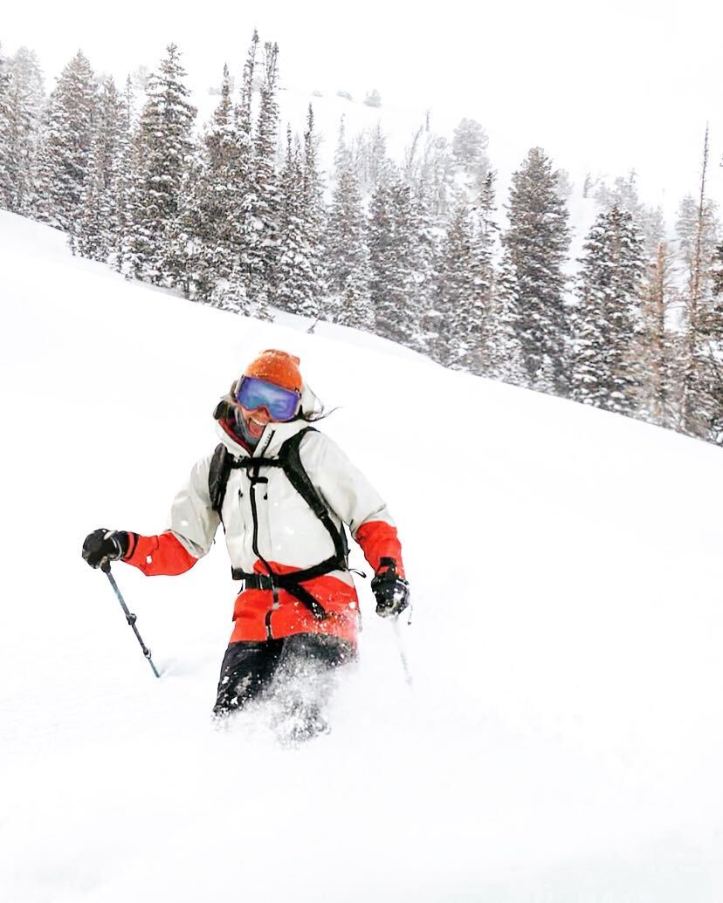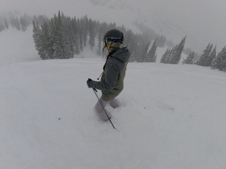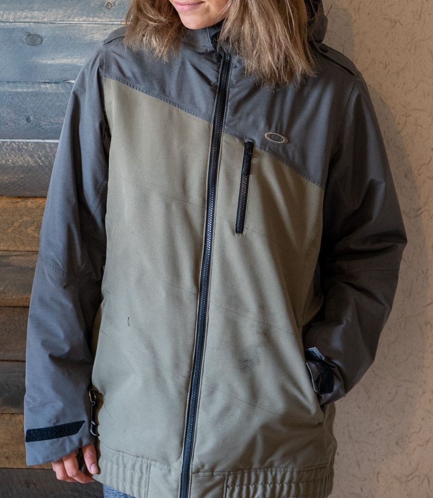This is my main jacket. It’s super warm, and it’s my favorite color. There are plenty of zipper pockets, on the inside, outside, and on the arm (perfect for my pass). The powder skirt is helpful for deep days, and I love the extended length on the body. Because it was bought used, I had little choice over the available sizes. While the large is a little big on me, it works for skiing.